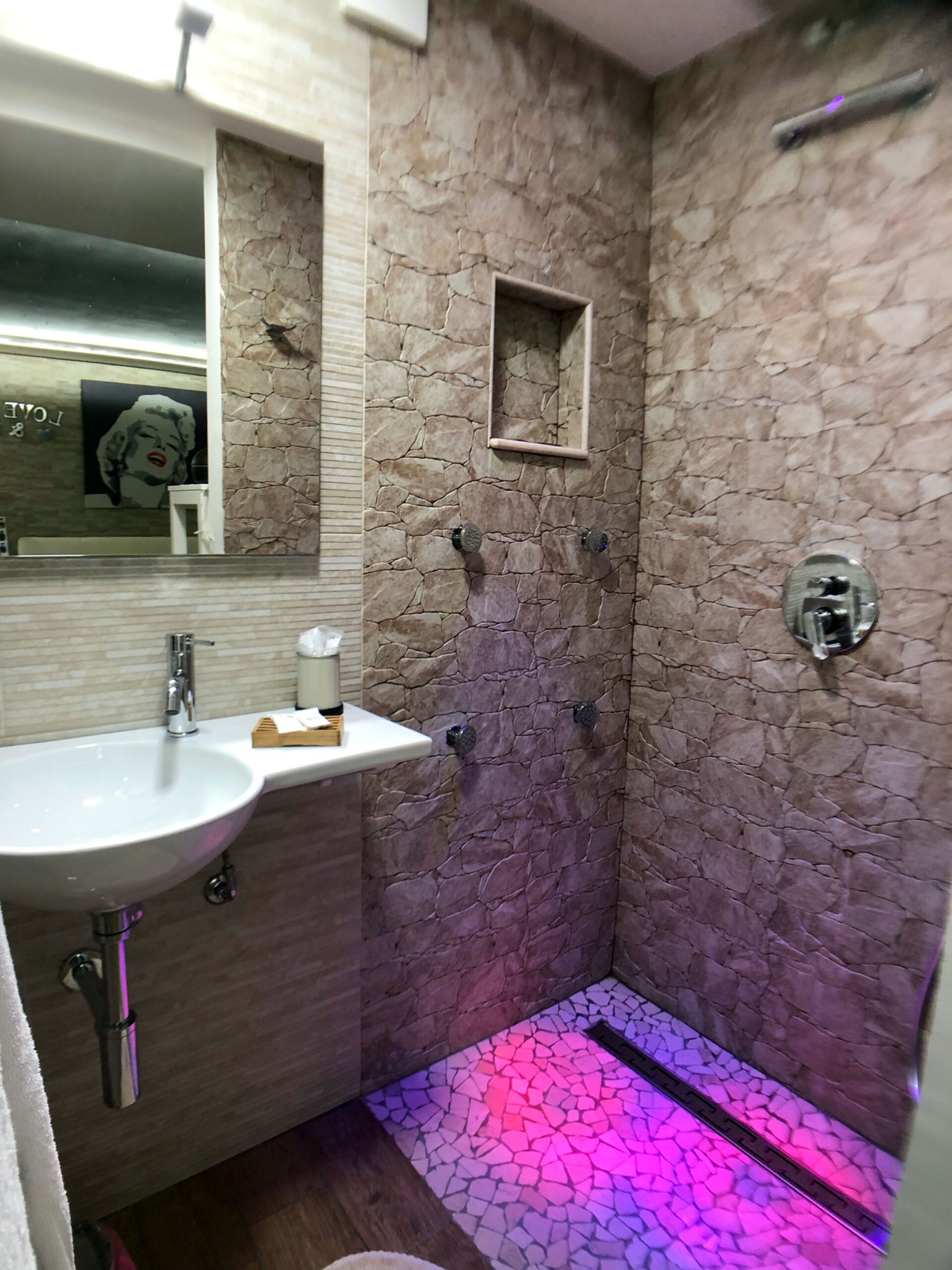 Designed to give you everything you’ve always wanted for your relaxation. The tank, measuring 180x120x66 cm, is equipped with 22 jets: 6 large water jets, 8 small water jets, 8 air jets on the bottom of the tank. It is also equipped with 2 head rests, chromotherapy, Bluetooth and loudspeakers. In the suite there is also a deluxe sauna for 2 people, a floor chromotherapy hydromassage shower with waterfall and hydromassage jets, starry sky in optical fiber.