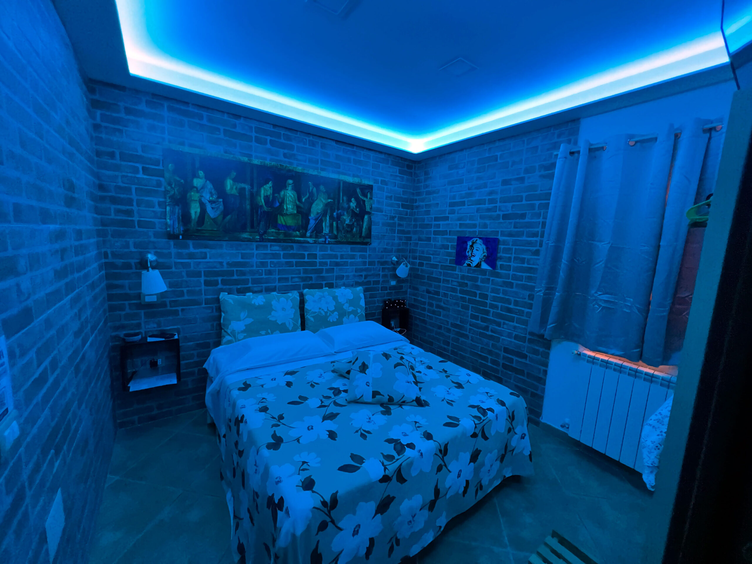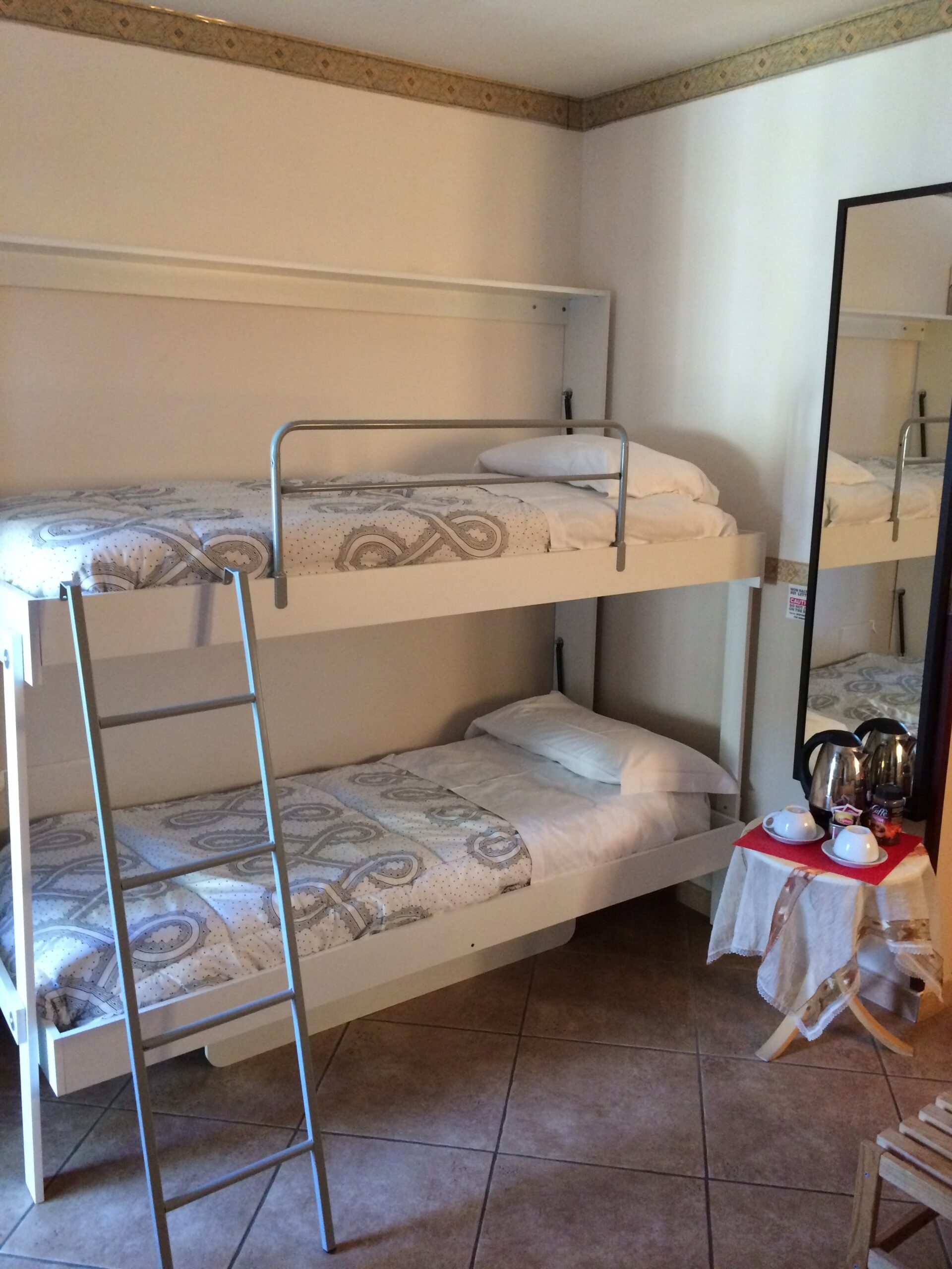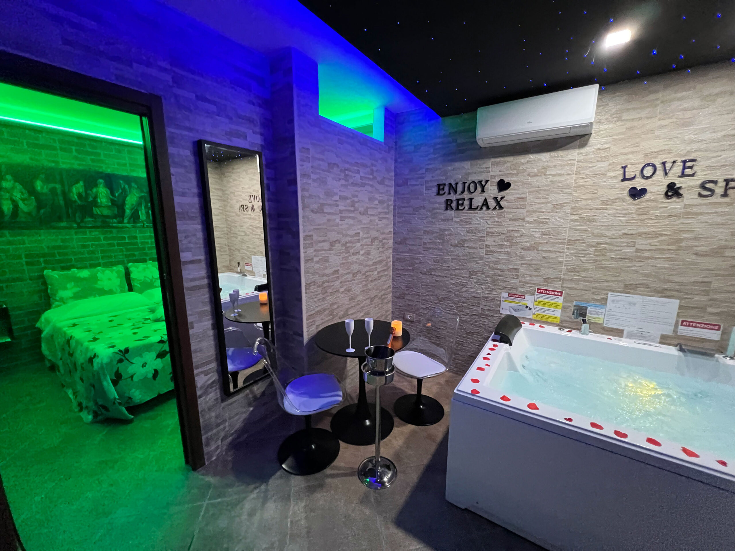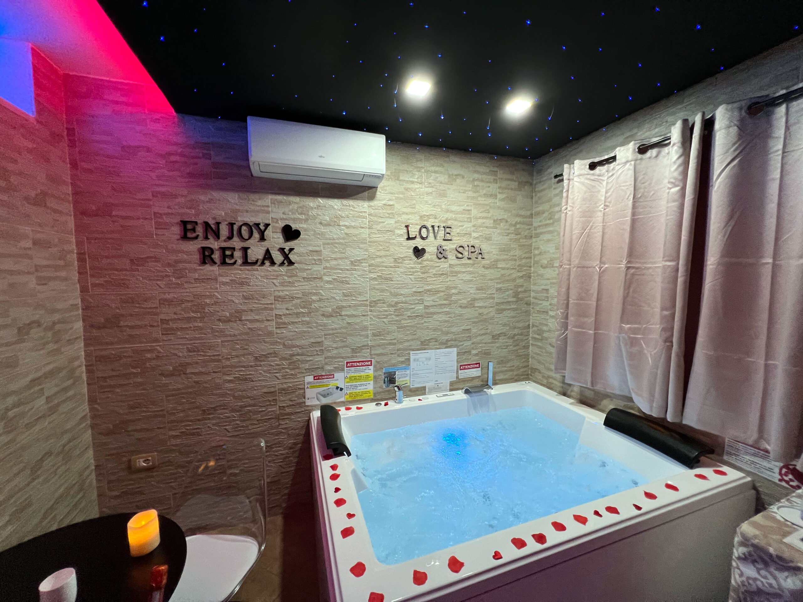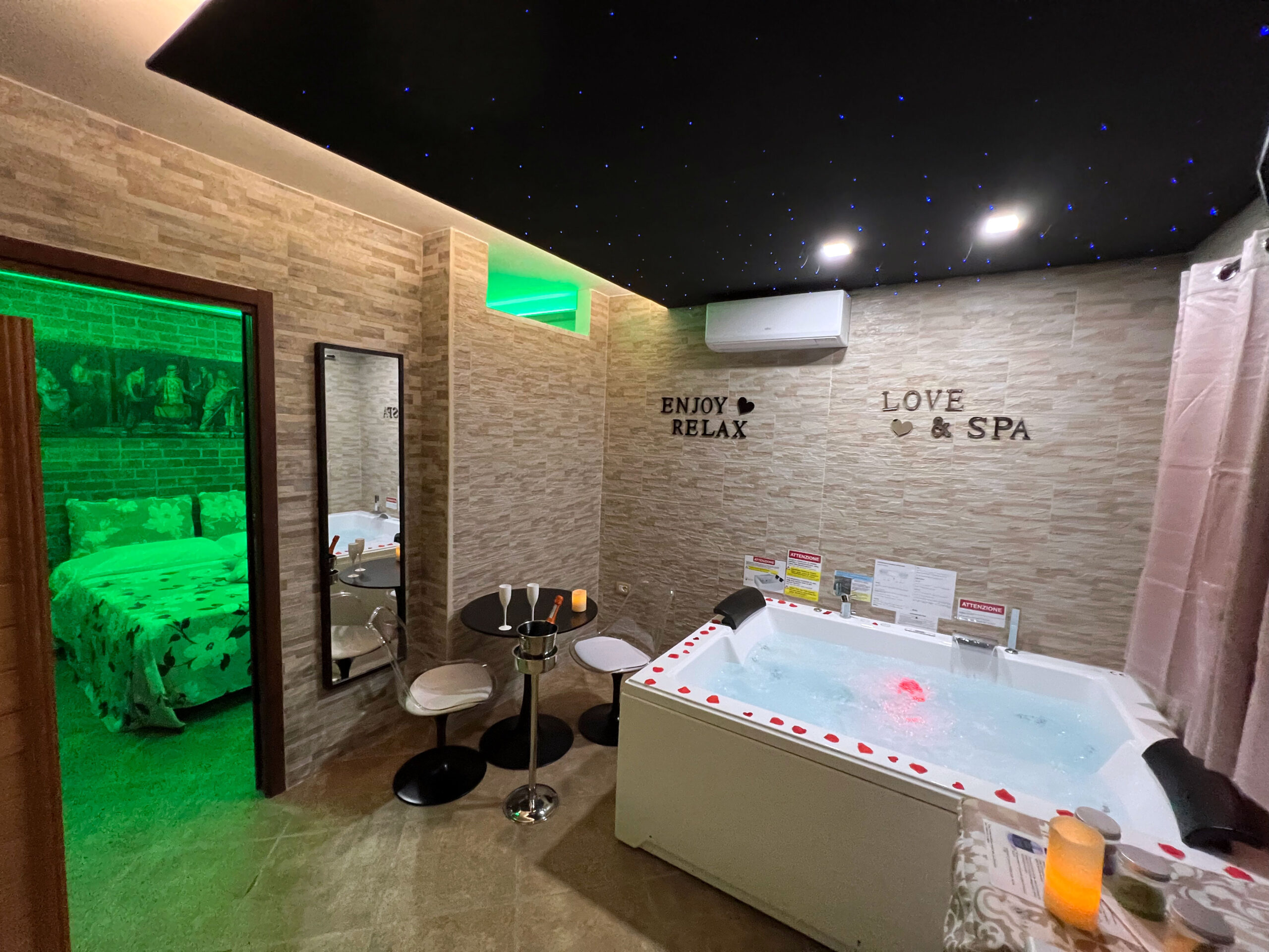 La Suite con Spa Maxi tiene dos habitaciones separadas: una con una cama doble grande y otra con una litera, con capacidad para 4 personas (Colchón de espuma viscoelástica de 9 capas con 2 almohadas de espuma de memoria en listones ortopédicos de madera), con baño privado para uso exclusivo (cabina de ducha grande con cascada, set de cortesía, artículos de tocador, toallas, secador de pelo, bidé, lavadora 6 kg).