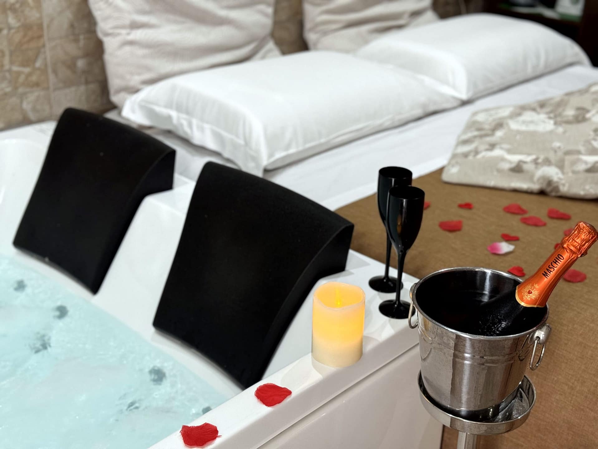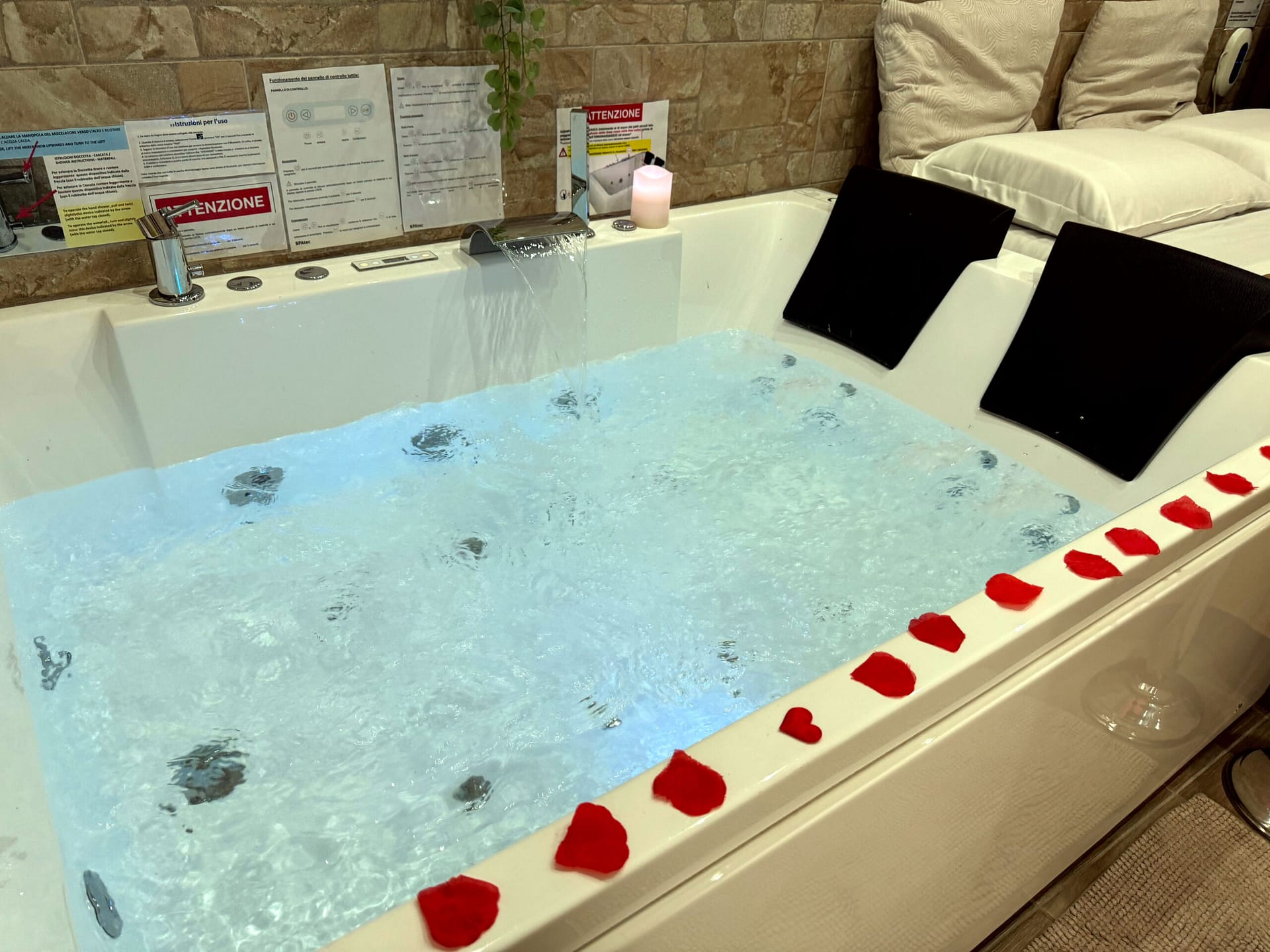 Lasciati viziare con un bagno caldo in questa spaziosa vasca idromassaggio dotata di ogni comfort. La vasca a bordo letto misura 170x120x61 cm, è dotata di 22 getti: 6 getti ad acqua grandi, 8 getti ad acqua piccoli, 8 getti ad aria sul fondo vasca. È dotata di 2 poggia testa, cromoterapia, sistema audio Bluetooth e casse acustiche. La vasca offre spazio per 2 adulti.