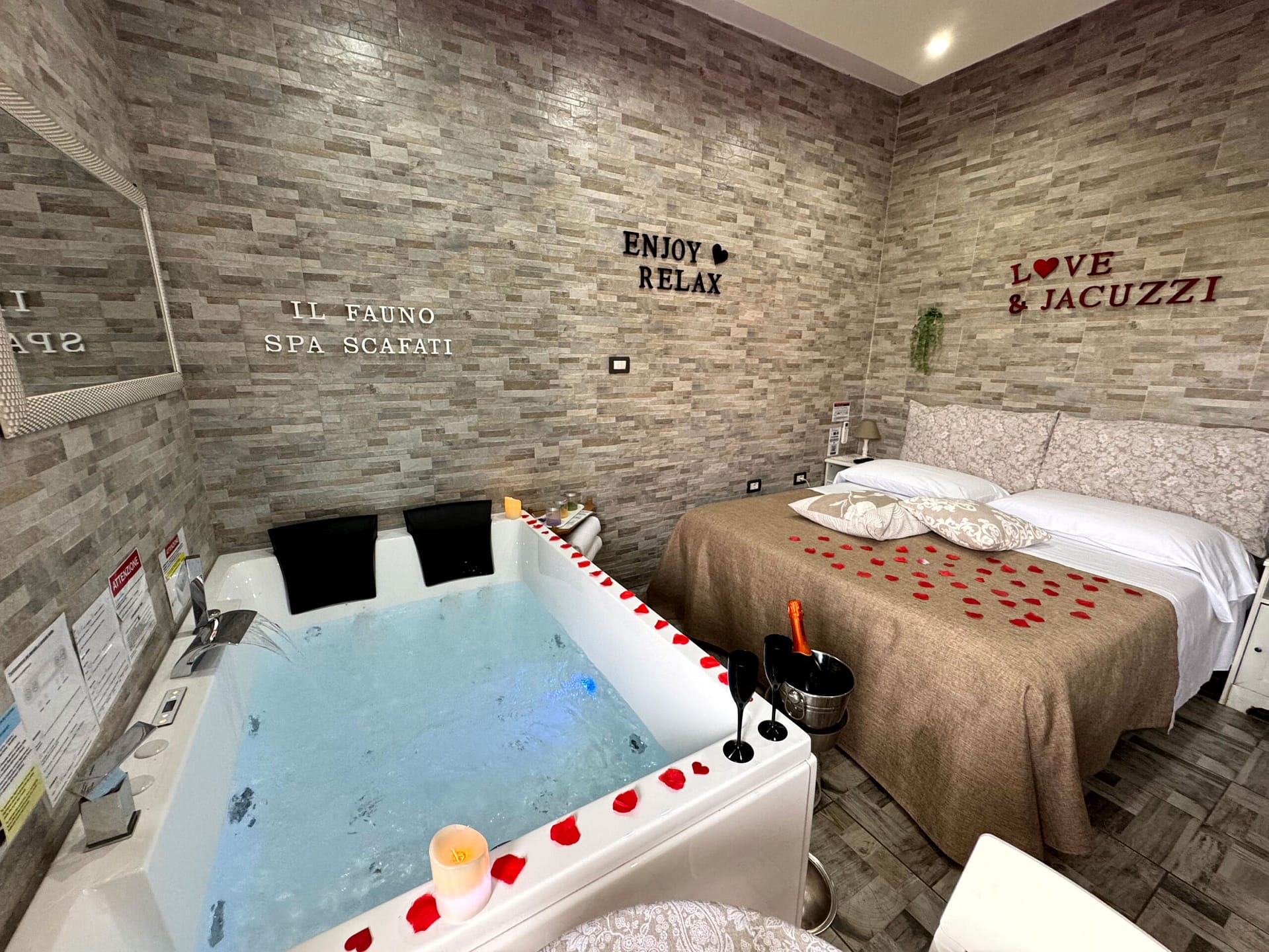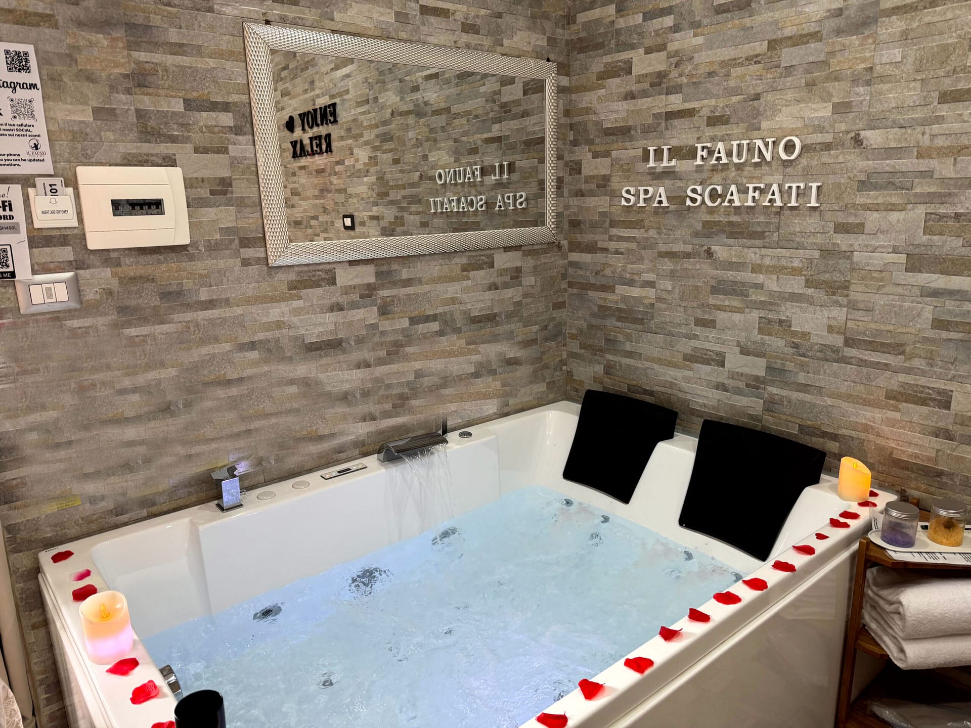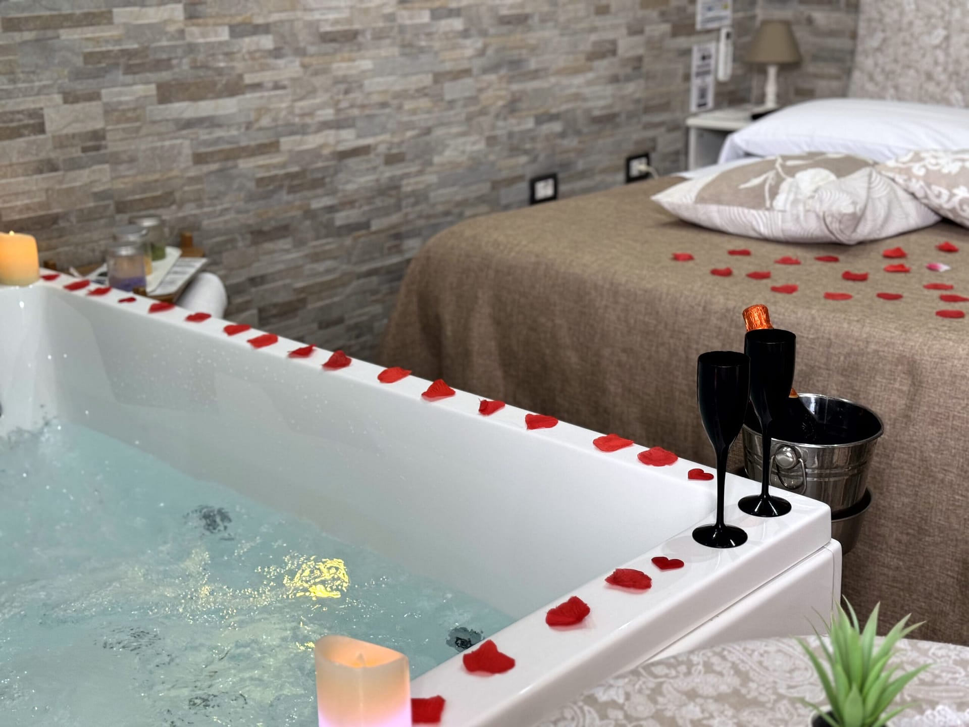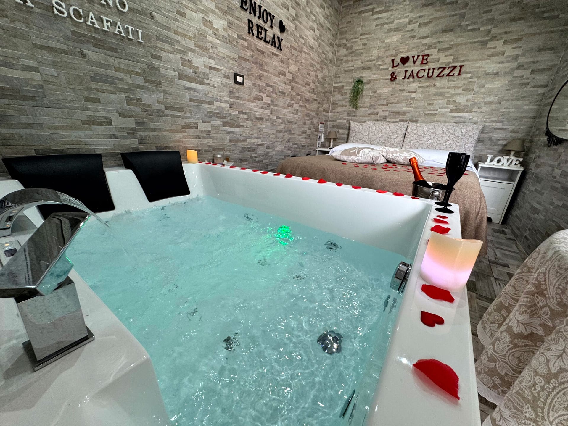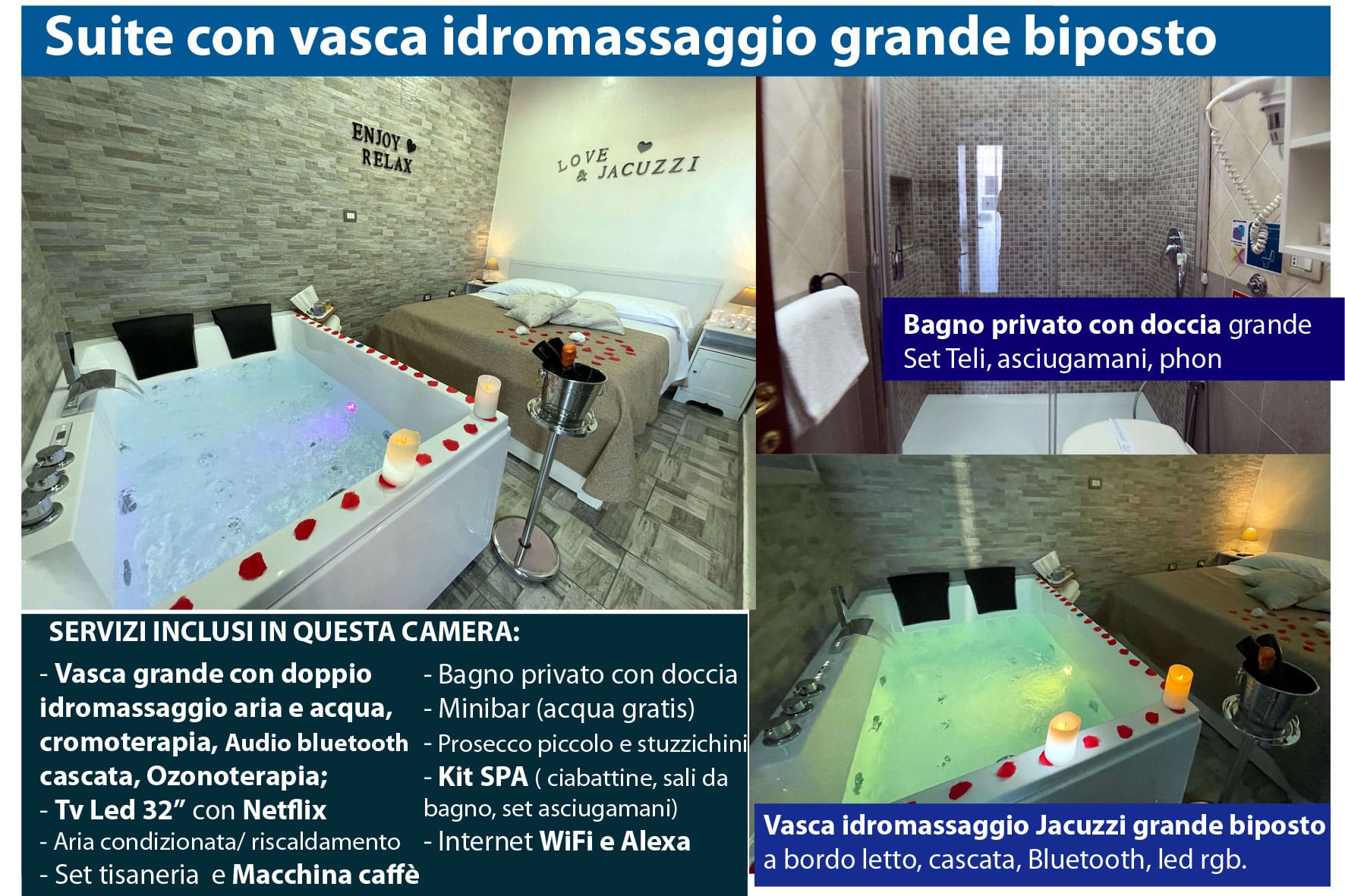 Suite con grande vasca idromassaggio biposto a bordo letto. Pensata per darti tutto ciò che hai sempre desiderato per il tuo relax. La vasca, di misure 180x120x61 cm, è dotata di 22 getti: 6 getti ad acqua grandi, 8 getti ad acqua piccoli, 8 getti ad aria sul fondo vasca. È dotata di 2 poggia testa, cromoterapia, sistema audio Bluetooth e casse acustiche.