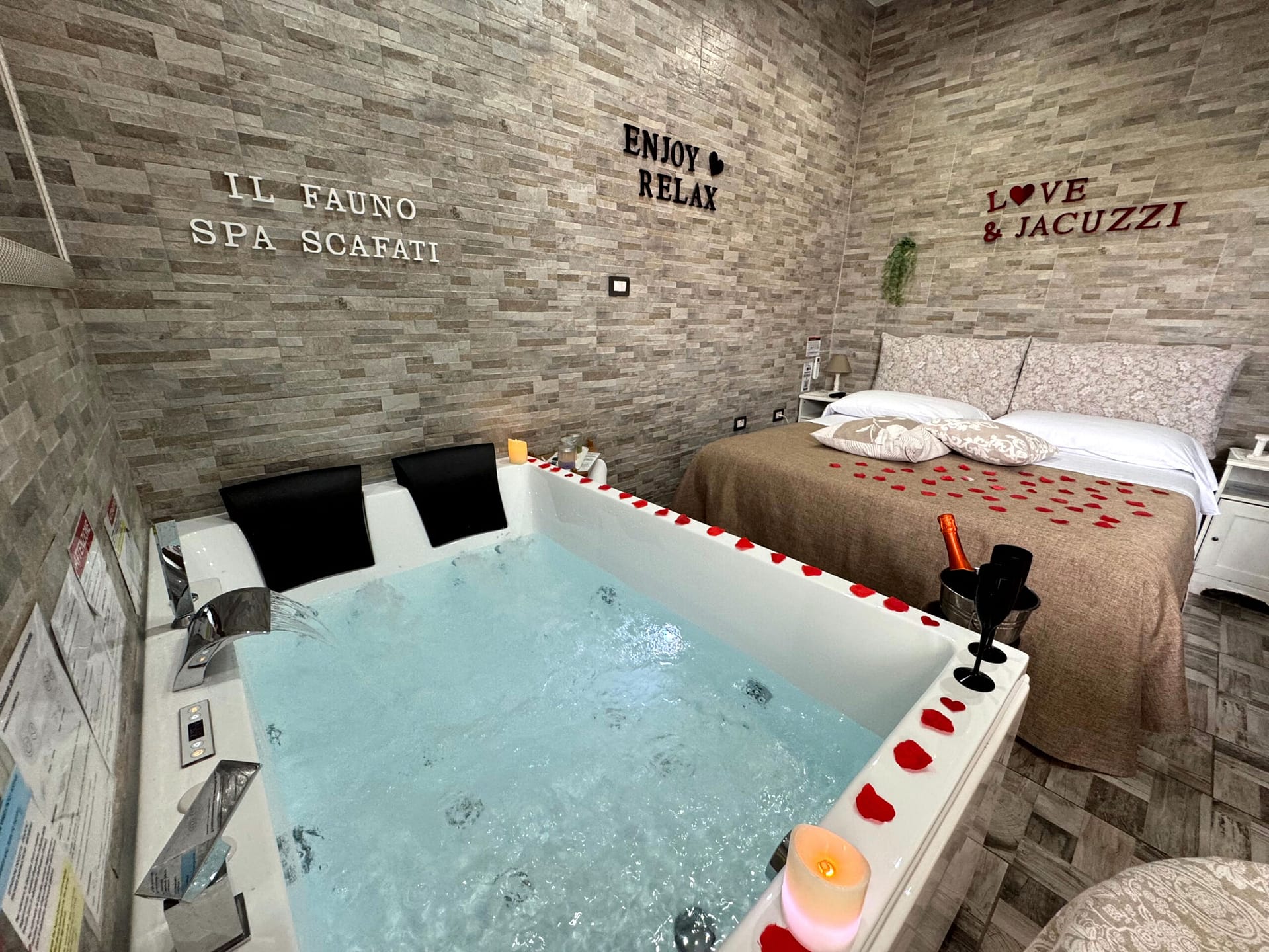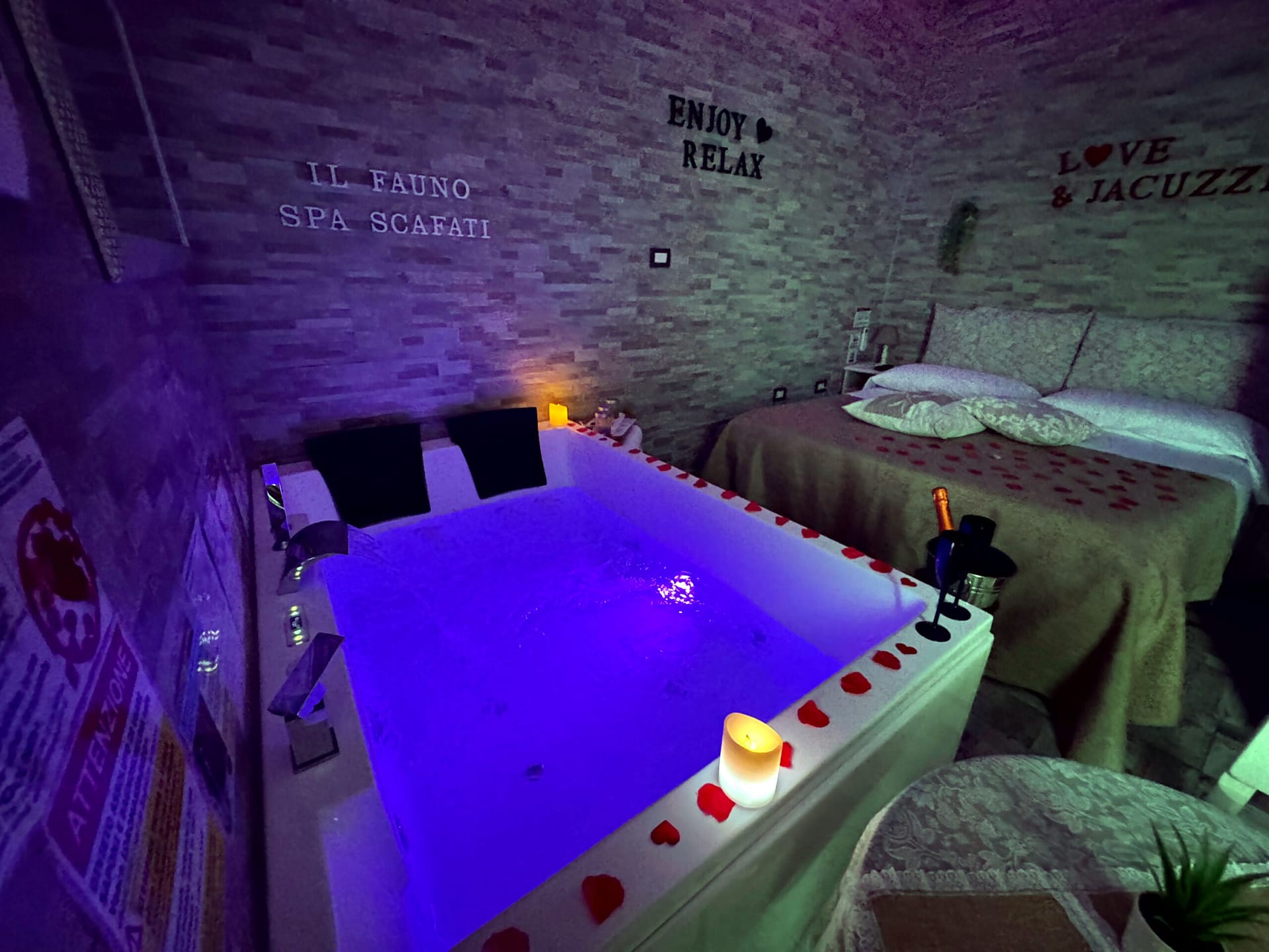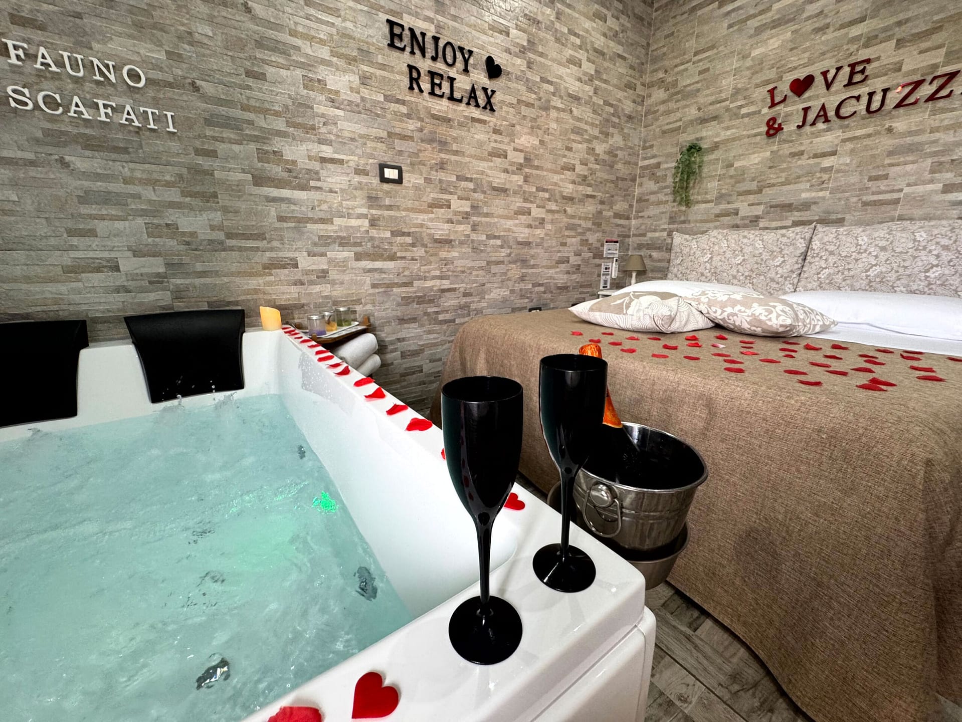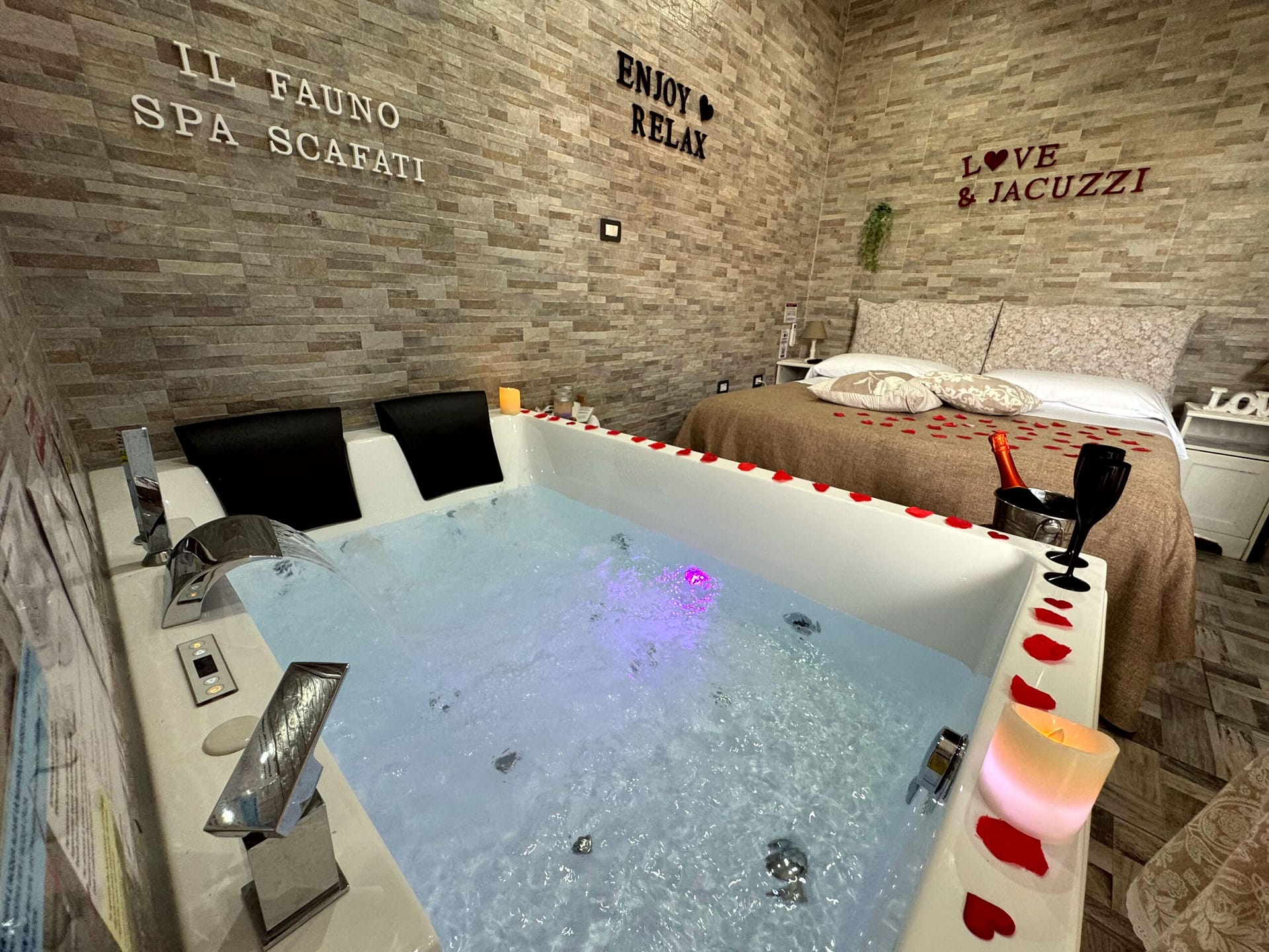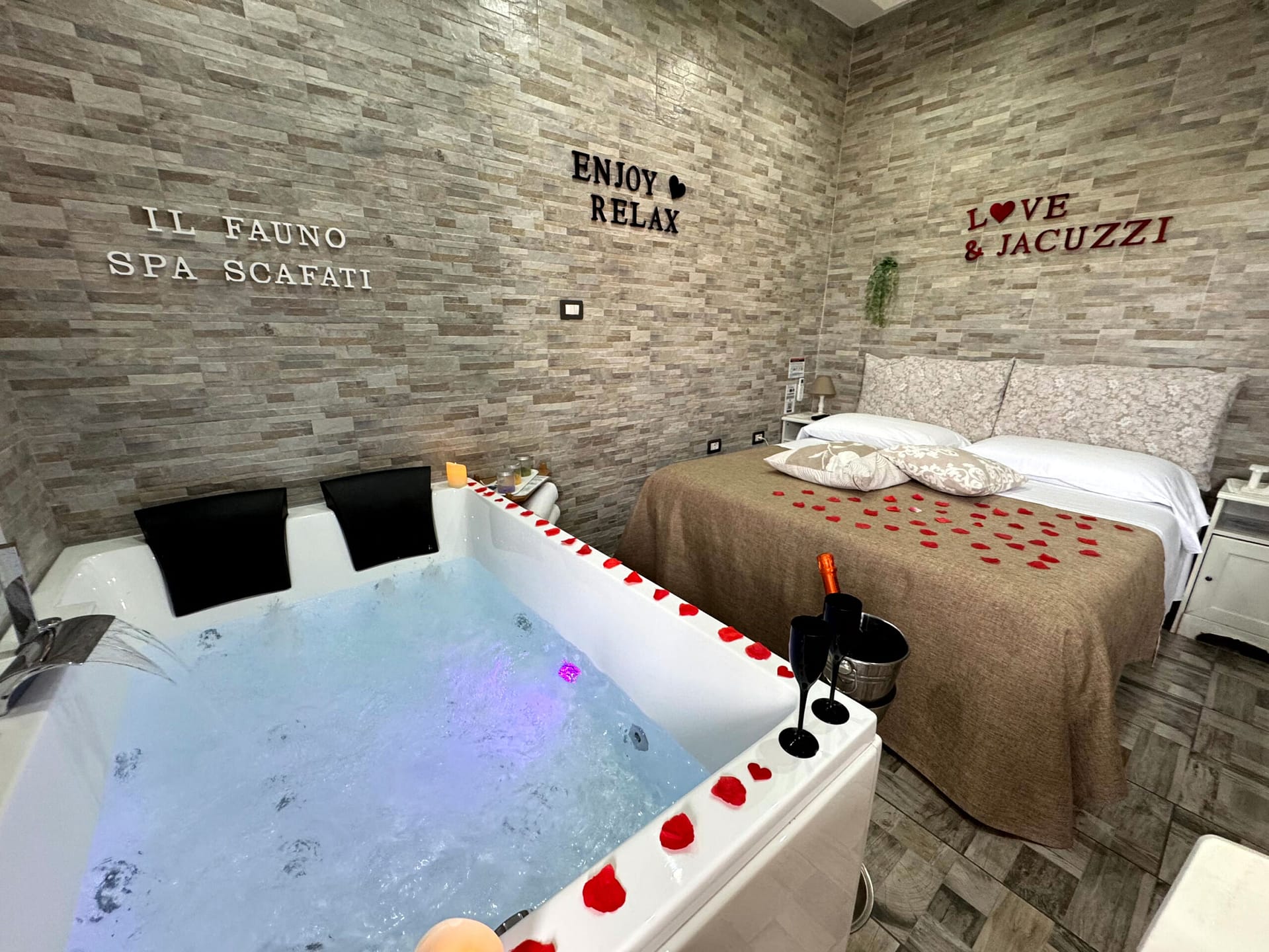 Suite con grande vasca idromassaggio biposto a bordo letto. Pensata per darti tutto ciò che hai sempre desiderato per il tuo relax. La vasca, di misure 180x120x61 cm, è dotata di 22 getti: 6 getti ad acqua grandi, 8 getti ad acqua piccoli, 8 getti ad aria sul fondo vasca. È dotata di 2 poggia testa, cromoterapia, sistema audio Bluetooth e casse acustiche.