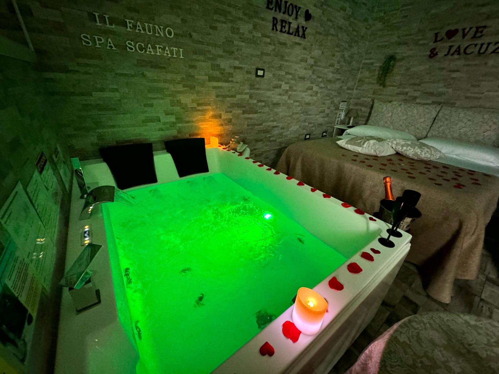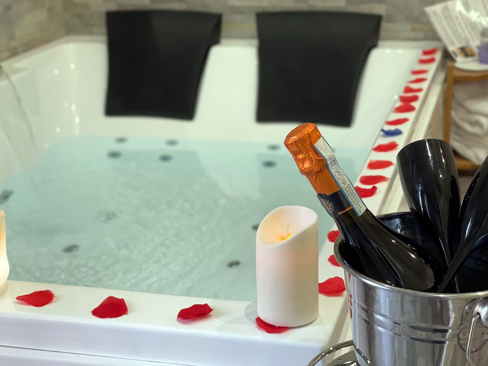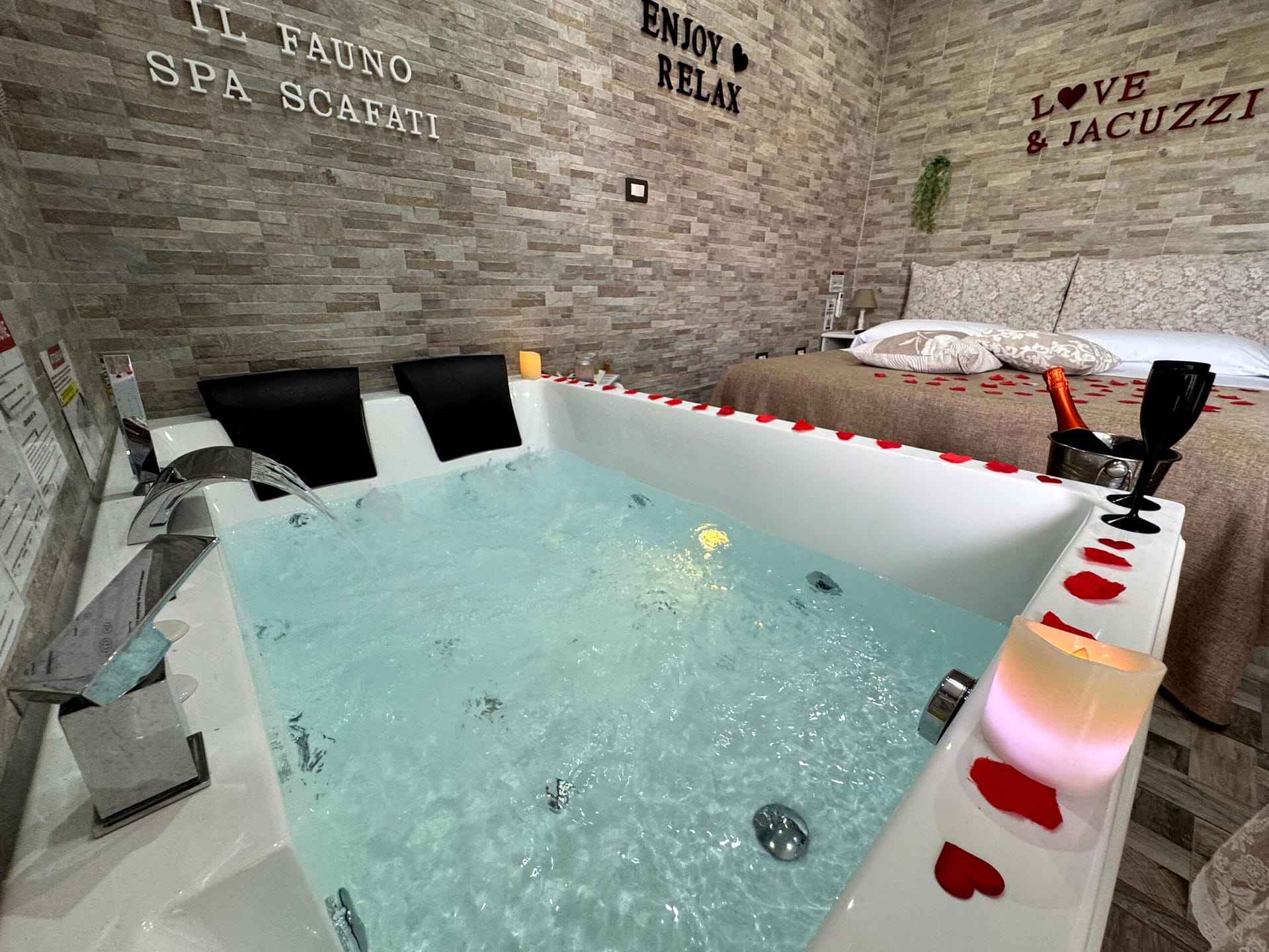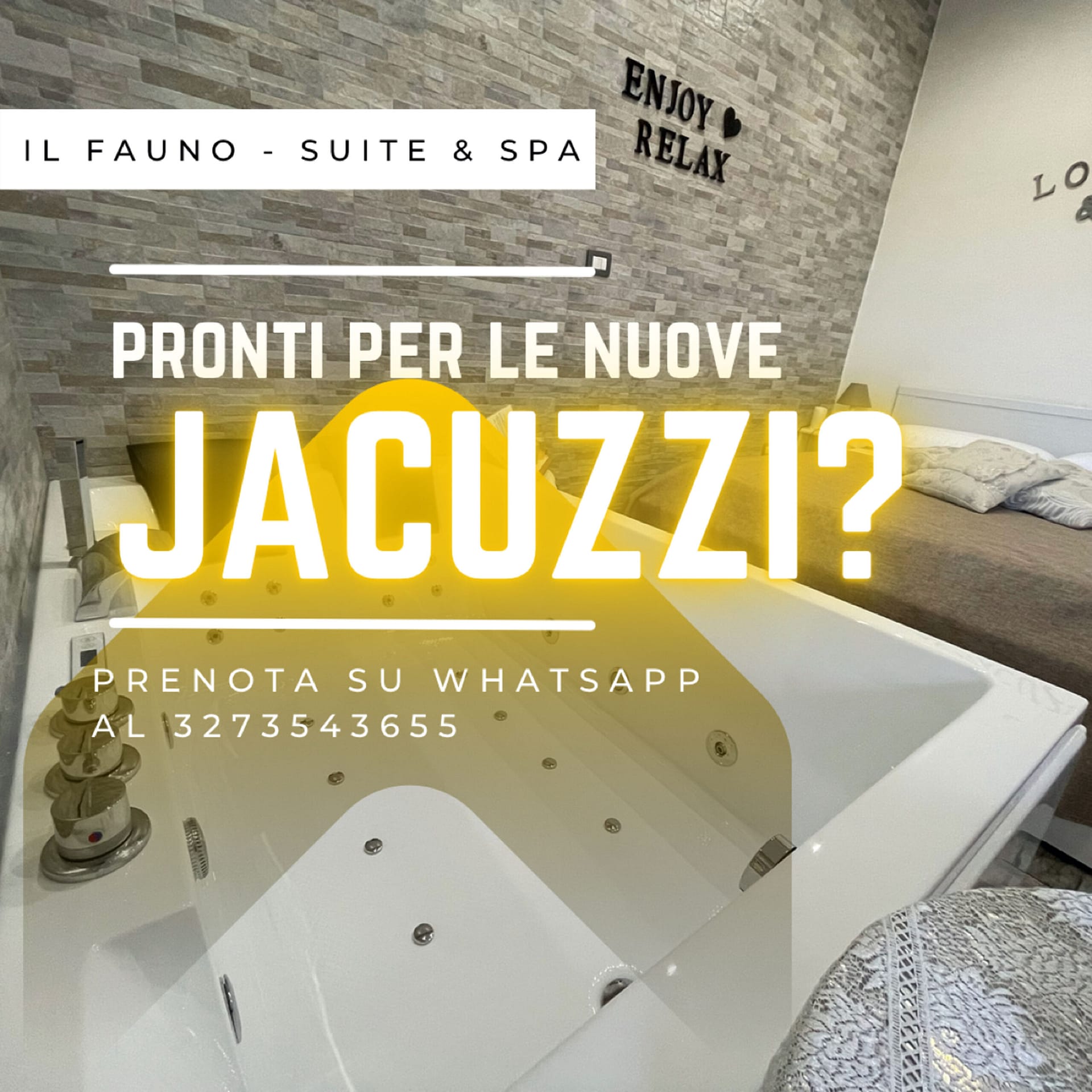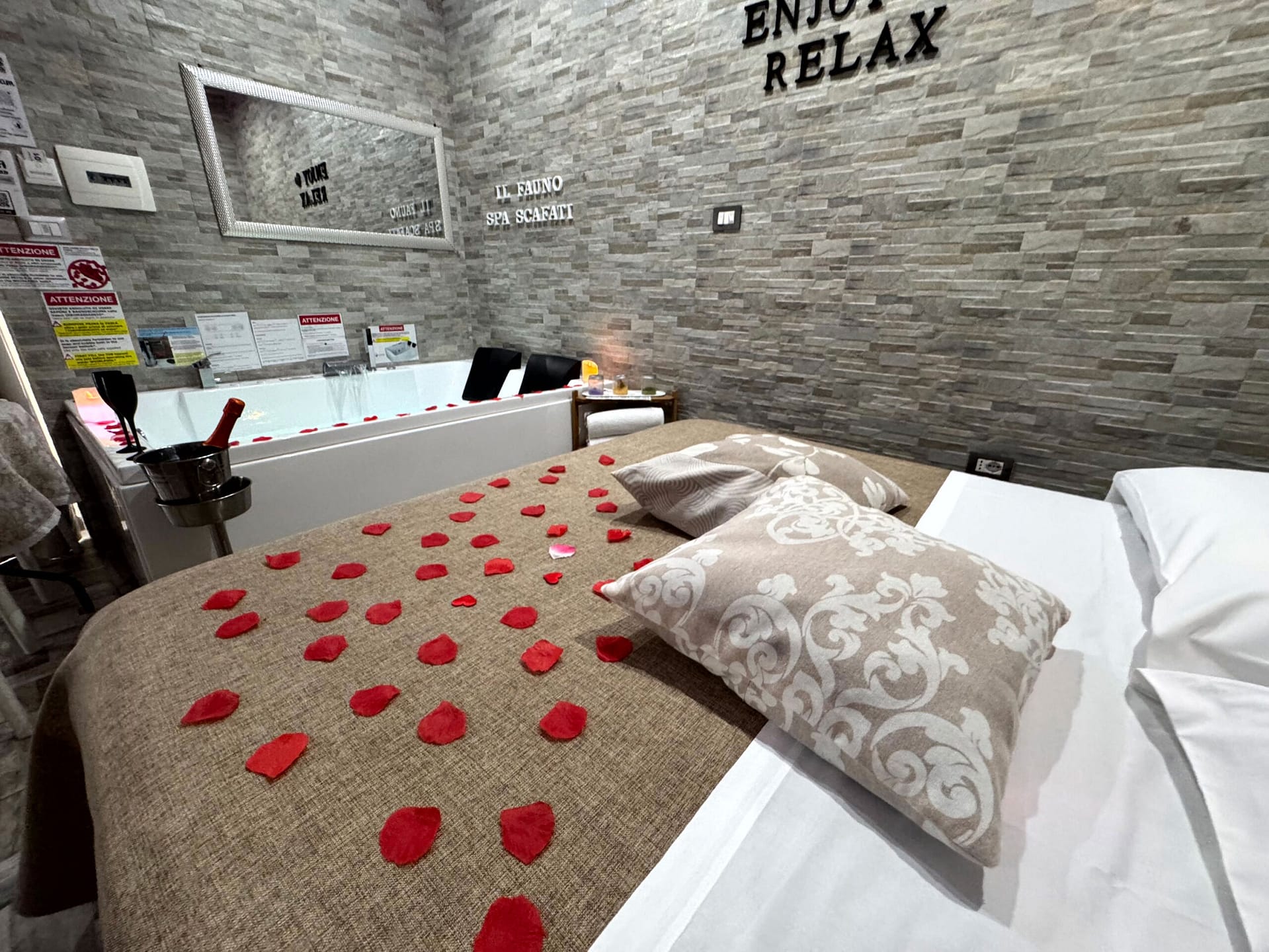 Suite con grande vasca idromassaggio biposto a bordo letto. Pensata per darti tutto ciò che hai sempre desiderato per il tuo relax. La vasca, di misure 180x120x61 cm, è dotata di 22 getti: 6 getti ad acqua grandi, 8 getti ad acqua piccoli, 8 getti ad aria sul fondo vasca. È dotata di 2 poggia testa, cromoterapia, sistema audio Bluetooth e casse acustiche.