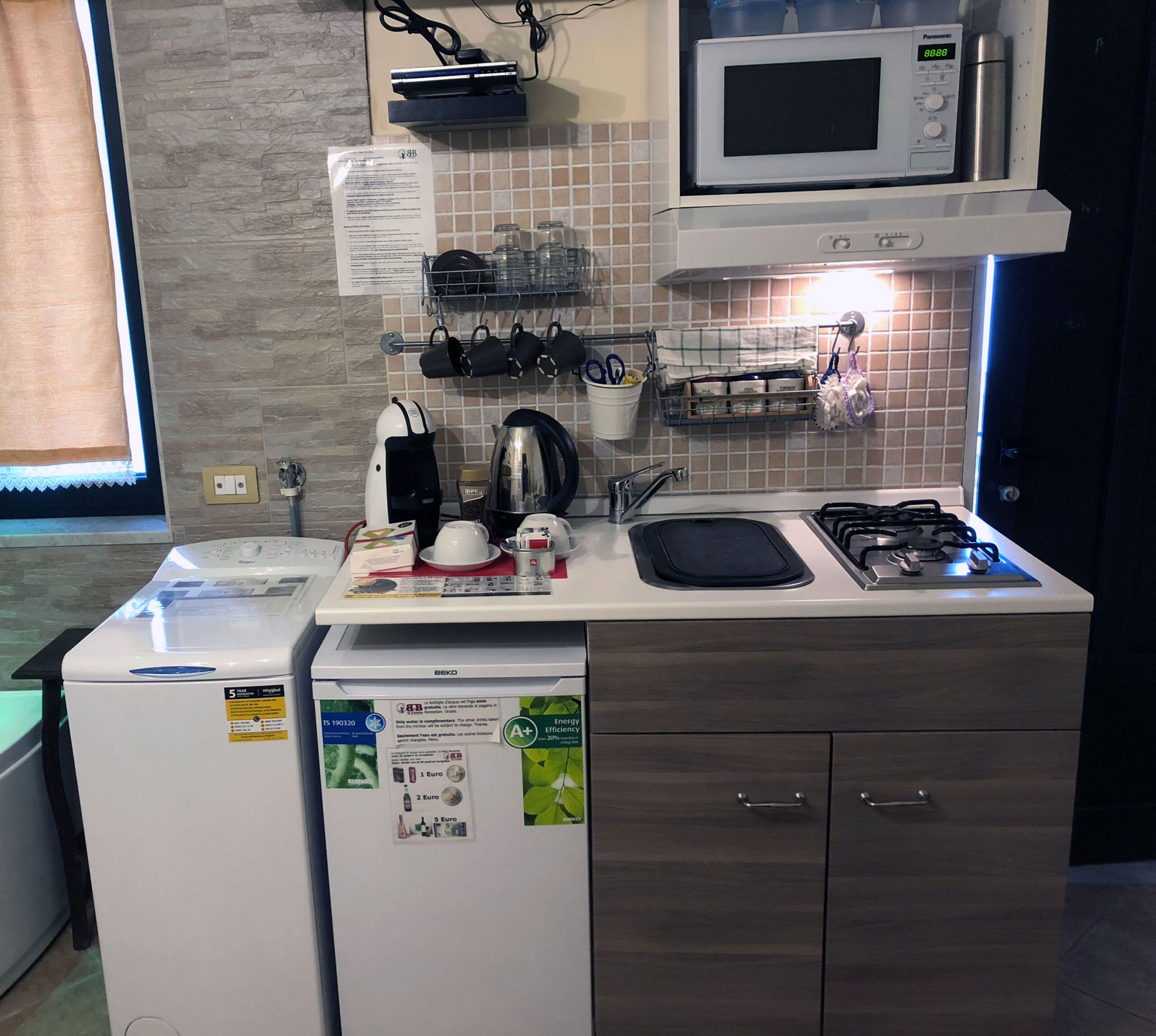 In questa Suite trovi anche una Lavatrice ed un angolo cottura attrezzato con tutto il necessario per cucinare (piano cottura 2 fuochi, lavello, microonde, stoviglie, pentole).